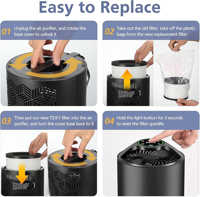 - EASY TO REPLACE: Our air purifier replacement filter tz-k1 is easy to replace. Take off the palstic bags from new filter and place it into your air puri-fier. Replace the TZ-K1 air filter each 3-6 months for optimal performance depends on your environment