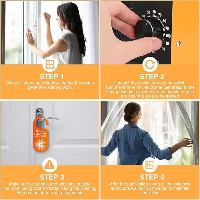 - ATTENTION:This ozone generator is designed for use in unoccupied spaces only. When the machine is operating, ensure all doors and windows are closed, and all people and pets have left the room. After the ozone generator stops working, ventilate the room for at least 30 minutes and ensure there is no ozone odor before re-entering.