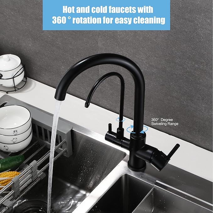 HUAHUALALA Kitchen Faucet with Filter Purifier, 3 in 1 Kitchen Faucet, 2 Handle Brass Drinking Water Faucet Reverse Osmosis Matte Black