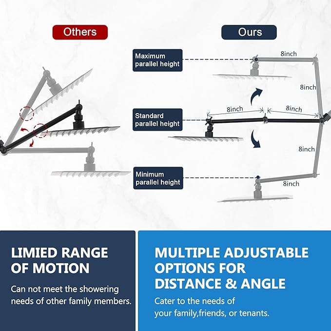 - 16 INCH BRASS SHOWER ARM: Vertical waterfall experience; 2-joint, 3-knob design for flexibility; Free-spin lock for level positioning; Built-in screws for stability