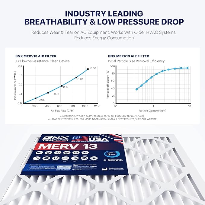 - SUPERIOR PERFORMANCE - The BNX MERV 13 air filter media outperforms standard fiberglass filters and adopts the latest in electrostatic filtration technology to capture maximum pollen, mold bacteria, smoke, carriers & other microscopic particles while maintaining industry leading superior low air flow resistance.