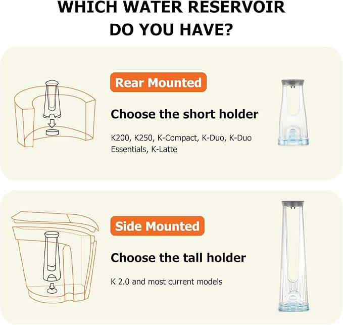 - Compatibility: The short handle is only compatible with the Rear Reservoir water tank SHORTER than 8” Tall, fits Keurig 2.0 K200, K250, K-Compact, K-Duo, K-Duo Hot & Iced Gen 2, K-Duo Essentials, K-Latte