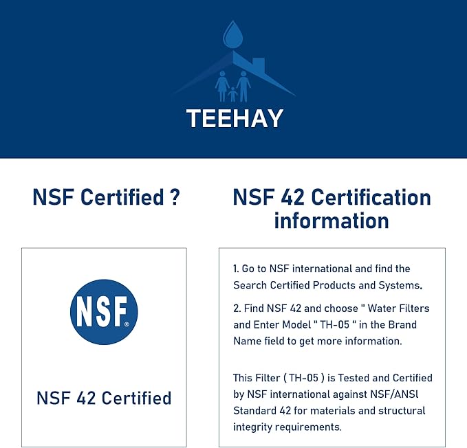 - This Filter (TH-05) is Tested and Certified by NSF international against NSF/ANSI Standard 42 for materials and structural integrity requirements.