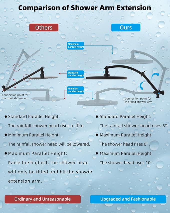 - 【Adjustable 16'' Shower Arm Extension】Compared with the regular shower arm extender, Hibbent shower arm extension raises the shower head higher or lower and keeps the shower head in a horizontal position all the way. Height & angle adjustable arc-shaped design enhances its bearing capacity and raises your shower head to achieve vertical water. The shower head is always vertical in your large size and will not hit the shower arm, instead of sloping water like an ordinary straight shower arm