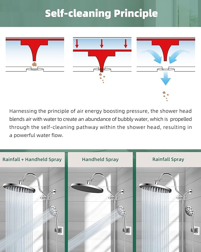 - 【Self-cleaning Nozzles】Featuring built-in cleaning nozzles, these shower heads are designed to prevent obstructions and clogs, ensuring a consistently strong and uninterrupted water flow for a refreshing and satisfying shower experience every time. The self-cleaning nozzles retract effortlessly during use, allowing water to flow freely, and automatically reset and cleanse any dirt or debris from the outlet holes once the water stops, maintaining optimal performance.