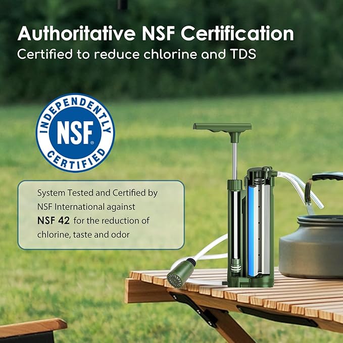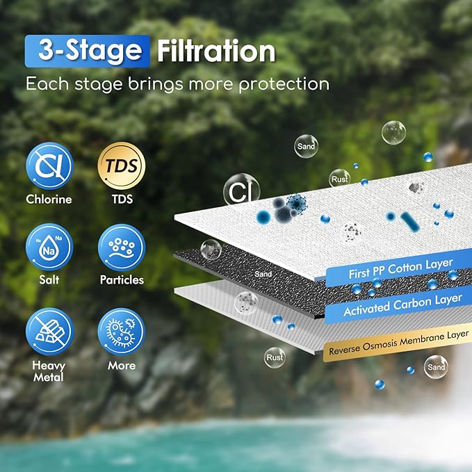 - 3-Stage Filtration - First stage, the filter media is PP cotton, it plays a role as a pre-filter and can filter out sediment and other particles in water. Second stage, the filter media is natural coconut activated carbon, which effectively reduces chlorine and improves taste. Third stage, the filter media is 0.0001Ξm Reverse Osmosis Membrane, which reduces heavy metals, TDS, salt and nitrates, etc. This water filter pump has also passed authoritative NSF 42 certification.