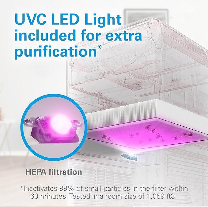 - THREE-STAGE AIR FILTRATION: Powerful filtration starts with pre-filters and a HEPA filter to reduce harmful particulates. A carbon filter then removes odor-causing particles, while UVC LED Light technology inactivates bacteria and viruses that are trapped in the HEPA filter. Improves air quality by capturing airborne irritants so tiny, you may not even know they're there!