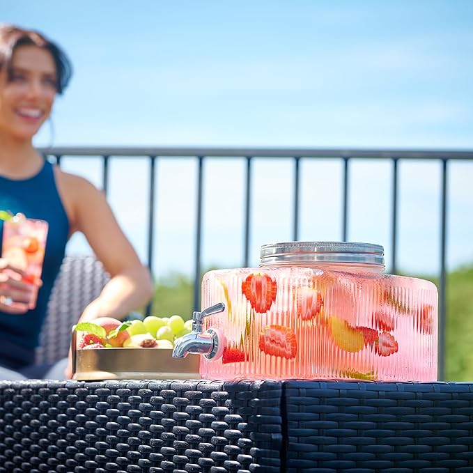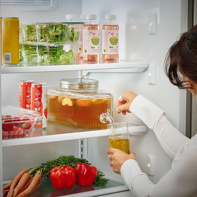 - BEAUTIFUL & DURABLE: This fridge dispenser is well-made with High-quality durable thick glass made by the best manufacturer in the world. It will surely enhance your party or home with a beautiful look. Convenient wide-mouth stainless steel lid for a safe seal to keep your drink fresh and also includes a leak-proof stainless steel spout that is easy to turn, Drip-free, lead-free & and rust-resistant.