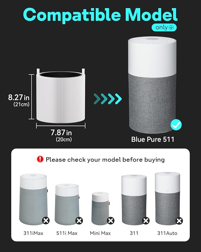 - 【NOTE】: ONLY fits Blue Pure 511 Air Purifier. Not compatible with 511i max, 511 Auto, 211+ and 211+ Auto, 411i max, 411a max, 311 Auto, 121, or other models. Please verify the model number before making your purchase