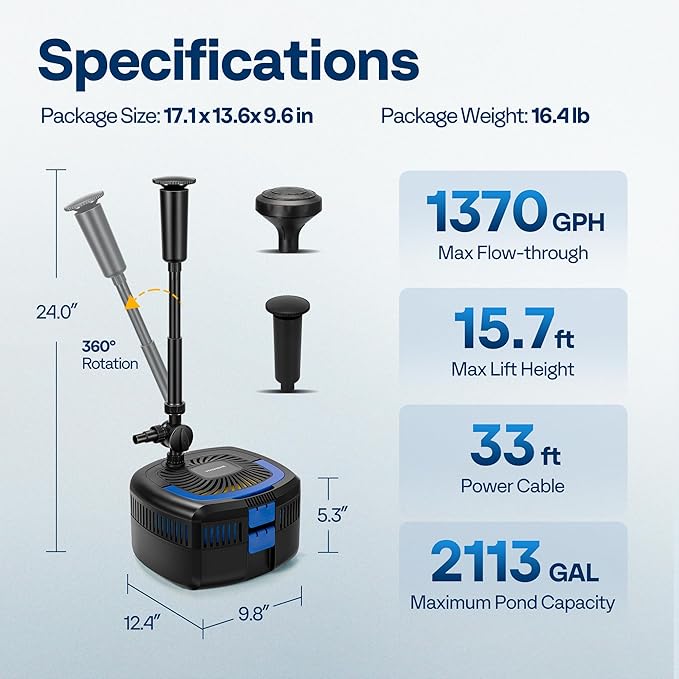 - USER-FRIENDLY DESIGN: Featuring a 33-foot ETL-certified power cord and an IPX8 waterproof rating, this system is designed for safe and stable operation; This pond fountain has a portable handle for easy handling; Its durable construction ensures long-lasting performance, making it a reliable choice for outdoor pond maintenance; Lightweight and compact design makes it perfect for fountains, pond and hydroponic systems