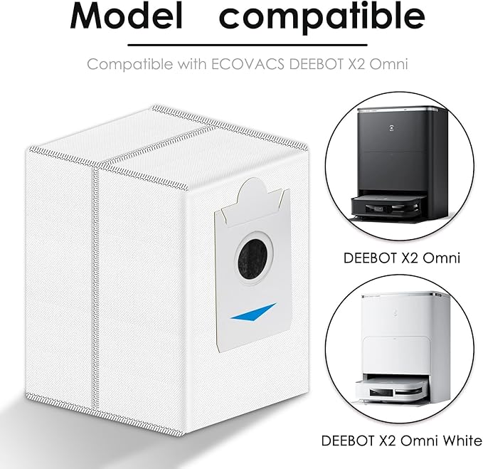 - 【Perfect Compatibility】 The Replacement Vacuum bags are compatible with ECOVACS DEEBOT T30S, T30S Pro, T30S AI, T30S Care, X5 Omni, X5 Pro Omni, X2, X2 Omni, DEX86 robotic vacuum cleaner. The installation method of the dust bag is the same as the original dust bag, which is easy to install and easy to use. Please be noted that: This is not an OEM product. Any use of the brand name or model name is intended solely to demonstrate compatibility of this product.