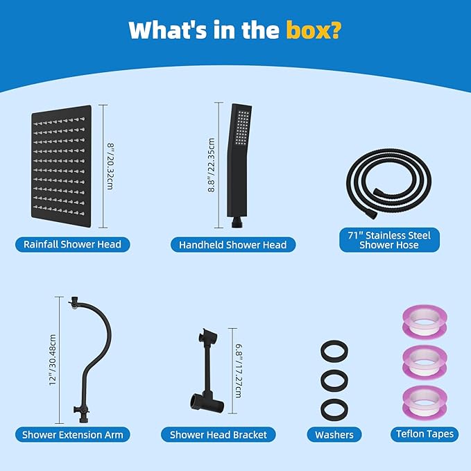 - Shower Head Combo: Hibbent shower combination comes with an 8'' rain shower head, handheld shower head, 71'' hose, 12'' extension arm, shower head bracket, washers, Teflon tape, and installation manual. The extra-long 71'' shower hose is made of odorless EPDM, stainless steel and brass material that can be used in a high-temperature environment