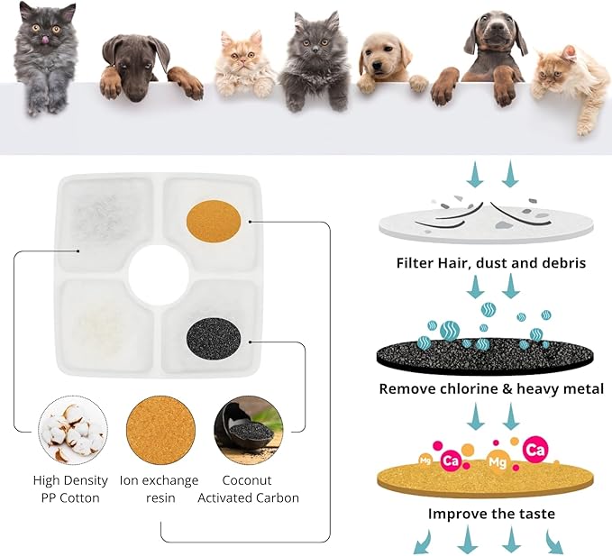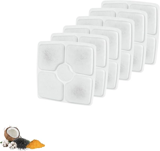 - 6 Packs premium charcoal water filter compatible with Veken 84OZ/2.5L Pet water fountains.
