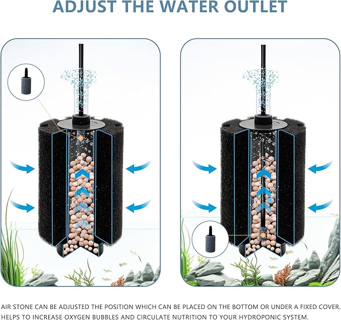 - 【Bubble Diffuser Design】The aquarium filter sponge adopts air power and water circulation.The Air stones creates tiny bubbles, smooth water flow, and reduced noise, creating a quiet and comfortable environment for your aquatic pet.