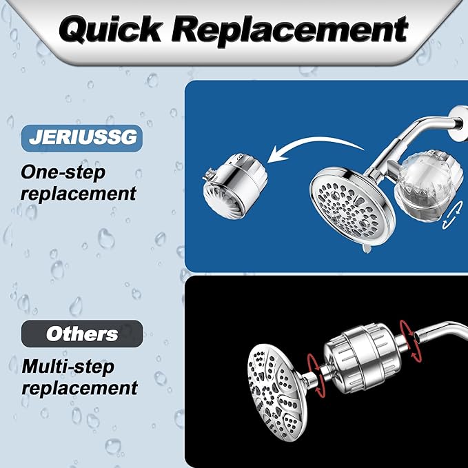 - SHOWER HEAD FILTER SYSTEM FOR HARD WATER - JERIUSSG filtering shower head is made of thickened ABS material with self-cleaning silicone nozzles, equipped with the latest design of removable shower filter and high-quality filter cartridge, which effectively filter out impurities and provide clean water, caring for your hair and skin