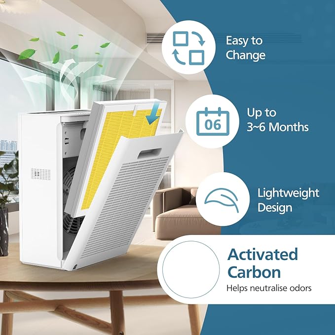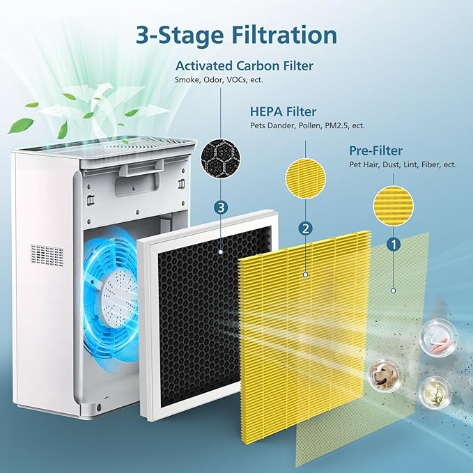 - 【3 STAGE OF FILTRATION】The premium G3 filter adopts 3 stage HEPA filtration technology, which includes a Pre-Filter, HEPA Filter, and Activated Carbon Filter. This ensures it effectively clean up nearly all kinds of airborne particles as small as 0.3 microns, as well as unwanted odors, including pet dander, dust, PM2.5, pollen, smoke, tiny particles, and VOCs. It provides your family with clean and fresh air, promoting a healthier living environment.
