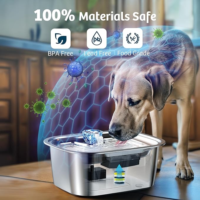 - [Keep your pet healthy] Dog water dispenser to provide your pets with clean and fresh water throughout the day, dog water fountain filtration system uses a combination of high-density activated carbon and ion exchange resin filters, capable of effectively removing hair and heavy metals from the water, while maintaining its quality and increasing oxygen content