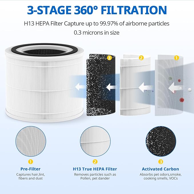 - 3-STAGE FILTRATION: Our HP-14 replacement filter for 240 air purifier filter is premium 3-stage true HEPA filtration systems including fine pre-filter, grade true HEPA filter and high efficiency activated carbon filter. They work together to capture up 99.97% of all airborne particles down to 0.3 microns in the air like dust, hairs, pet fur, lint, and prolongs the life of 240 air purifier to keep from dust, pollen, smoke particles, pet dander, creating fresh