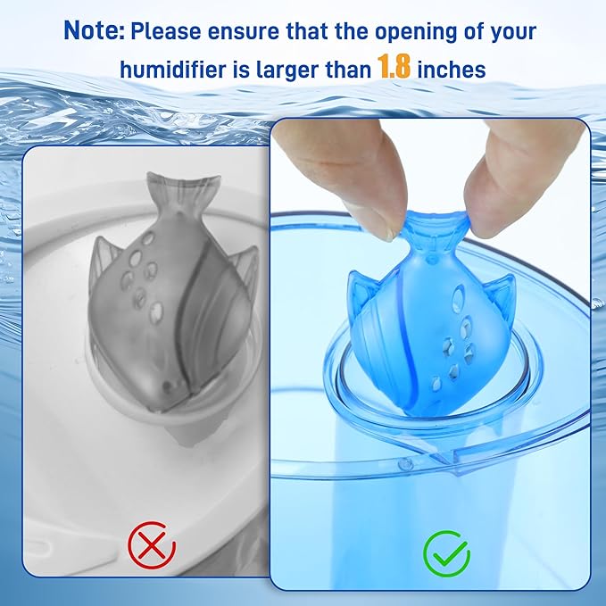- šš¢š š£šš§šššš š š¢šššš¦ - The versatile humidifier cleaning fish is suitable for almost all home humidifiers, vaporizers and steamers including evaporative humidifiers, ultrasonic humidifiers, cool mist humidifiers and warm mist humidifier. Warm tips: The opening diameter of the humidifier should be at least 1.8 inches, please check if the opening of your humidifier is large enough. Meanwhile, it can be used in general purpose humidifiers with a tank capacity of 1 gallon and above