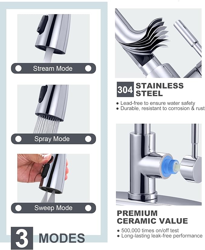 - 【Pull Down Kitchen Faucet】The sprayer pulls out up to 18 inches, making cleaning dead spots a breeze! 3 water modes (Stream/Spray/Sweep) to fully meet your filling, washing and rinsing needs. High-arc spout swivels 360° - Single handle control of water flow and temperature for more efficient cooking.