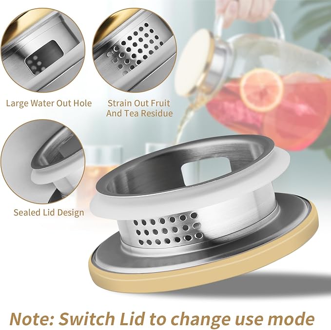 - Two Different Pour Functions: The iced tea pitcher comes with premium 304 stainless steel lid that has 2 different pour functions, one with tiny holes to act like a strainer to keep ice or fruits inside pitcher when pouring and 180 degree turn of the cap provides a βwiderβ mouth. The lid also has a silicone ring that improves sealing performance and reduces leaks or spills.