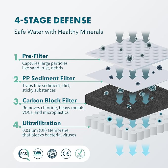 - š SUPERIOR FILTRATION TECHNOLOGY: 6-month UltraFiltration & Carbon filter removes >99% of contaminants - Lead, PFAS, Mercury, E-coli, Copper & Microplastics. 2-minute filtration speed saves time.