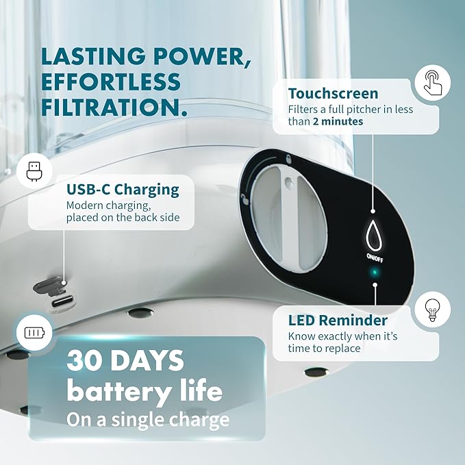 - ā” SMART ELECTRIC DESIGN: 30-day battery life, 50oz capacity, BPA-free materials. Filter change indicator. Modern design fits refrigerator shelves. Perfect for modern homes. Easy 3-Step Setup: Charge, Install, Prime ā Enjoy Fresh, Filtered Water in 2 Minutes.