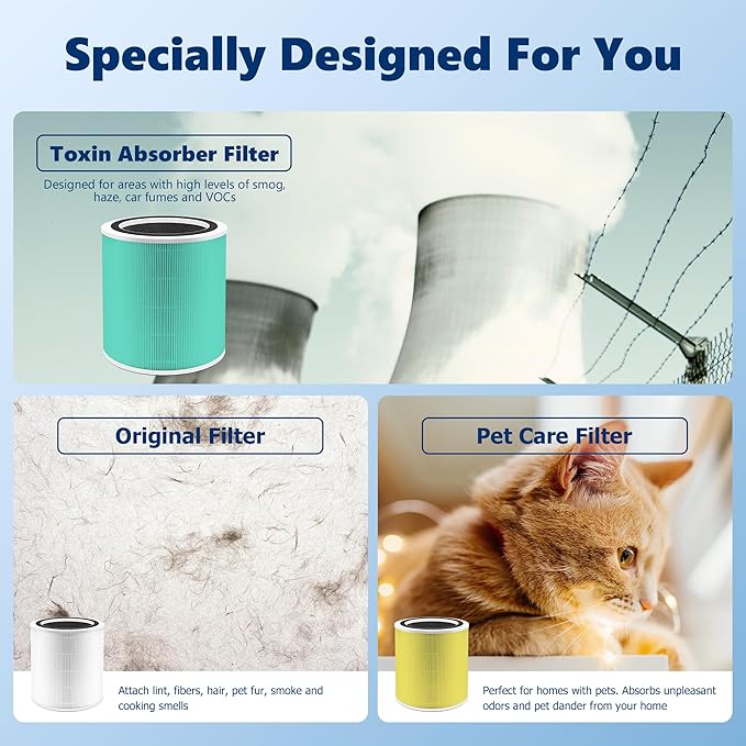 - 𝗠𝗨𝗟𝗧𝗜𝗣𝗟𝗘 𝗙𝗜𝗟𝗧𝗘𝗥 𝗖𝗛𝗢𝗜𝗖𝗘𝗦 - Choose from a variety of Funmit core 400s replacement filters to protect you and your pet's health. The White Basic Air Filter attach suspended airborne substance measured in microns and odors. The Yellow Pet Care Filter is ideal for households with pets. And the Green To-xin absorber Filter is specifically designed to attach extremely heavy odors, including smoke from mountain fires and automobile exhaust fumes