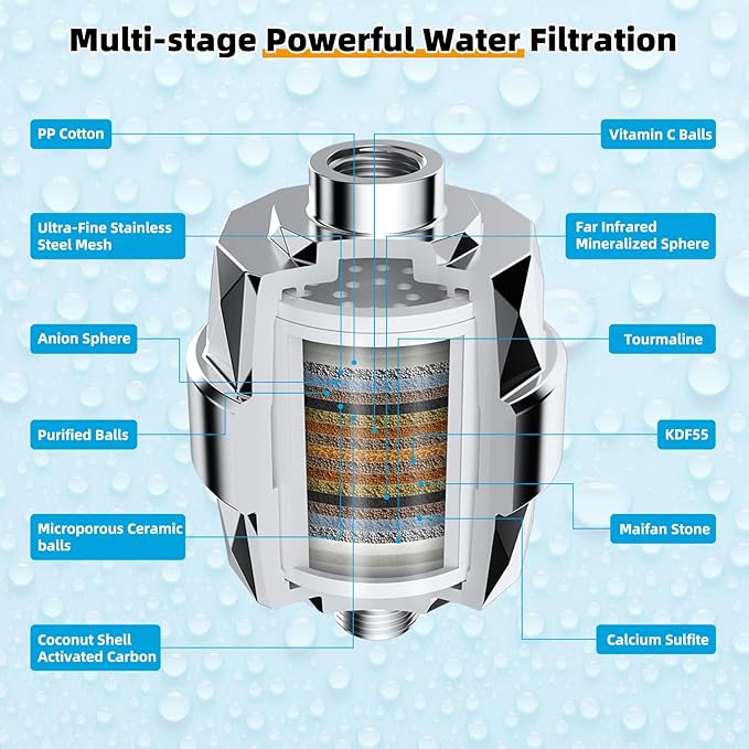 - [20 Stages Shower Filter] Immerse yourself in the luxury of the 20-stage shower filter, featuring a water purification system with redox media, calcium sulfite, activated carbon, and ceramic beads for exceptional filtration. Experience the elimination of odors, pH level balancing, and the infusion of beneficial minerals that nourish your skin, nails, and hair right from the initial use. This filter not only cleanses and moisturizes but also offers unparalleled care for sensitive skin.