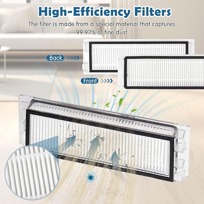 - GREAT VALUE PACKAGE: 2 Main Brushes, 8 Side Brushes, 6 HEPA Filters, 1 Cleaning Brush, 1 Screwdriver. The products are made of high-strength materials to ensure optimal performance and a healthier lifestyle
