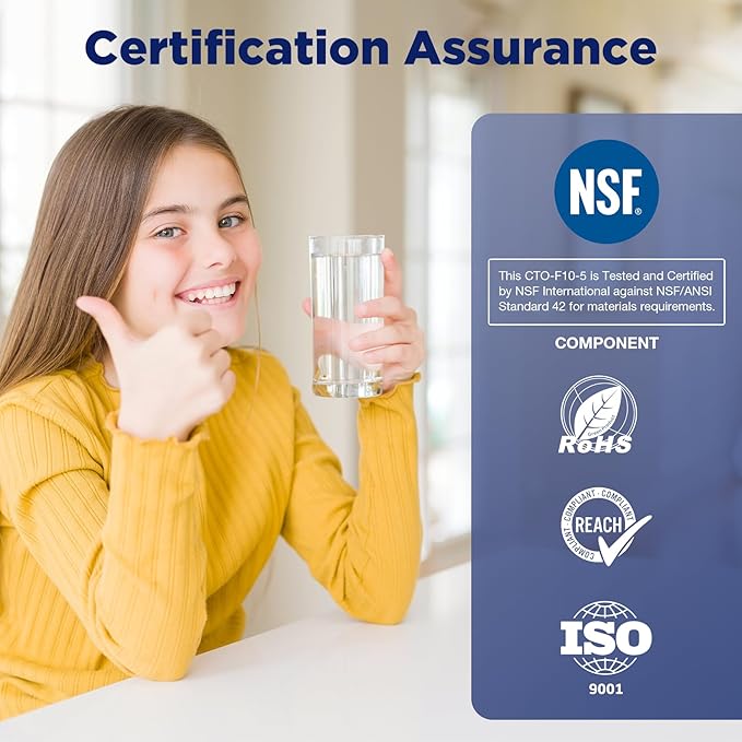 - EFFICIENT AND RELIABLE FILTRATION - Our CTO carbon filter has strong adsorption capacity. It can not only filter up to 99% of sediment, rust, silt, sand, iron, and other undissolved particulates, but also reduce the chlorine, odors to improve the water taste and quality.