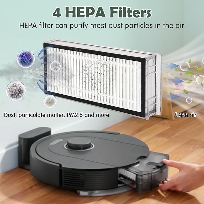- GREAT VALUE PACKAGE: 1 Dual Rubber Main Brush, 4 Mop Cloth Pads, 6 Side Brushes (Black), 4 Washable Filters, 1 Cleaning Brush, 1 Screwdriver. The products are made of high-strength materials to ensure optimal performance and a healthier lifestyle