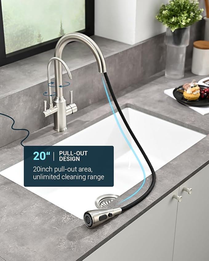 - Three-Function Sprayer & Filter Faucet: Enjoy the convenience of a three-function sprayer with the APPASO Kitchen Faucet, allowing you to easily switch between regular water flow and a powerful spray for efficient cleaning. The filter faucet feature provides you with peace of mind, knowing that your water is always clean and safe for consumption