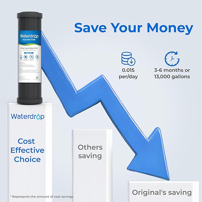 - Advanced Filtration: Waterdrop 1 micron whole-house CTO carbon filter is made of high-grade activated carbon, which can filter up to 99% chlorine, sand, colour, rust, sediment, bad taste and odor. It delivers purer water for your daily use, such as drinking, cooking, and coffee making.