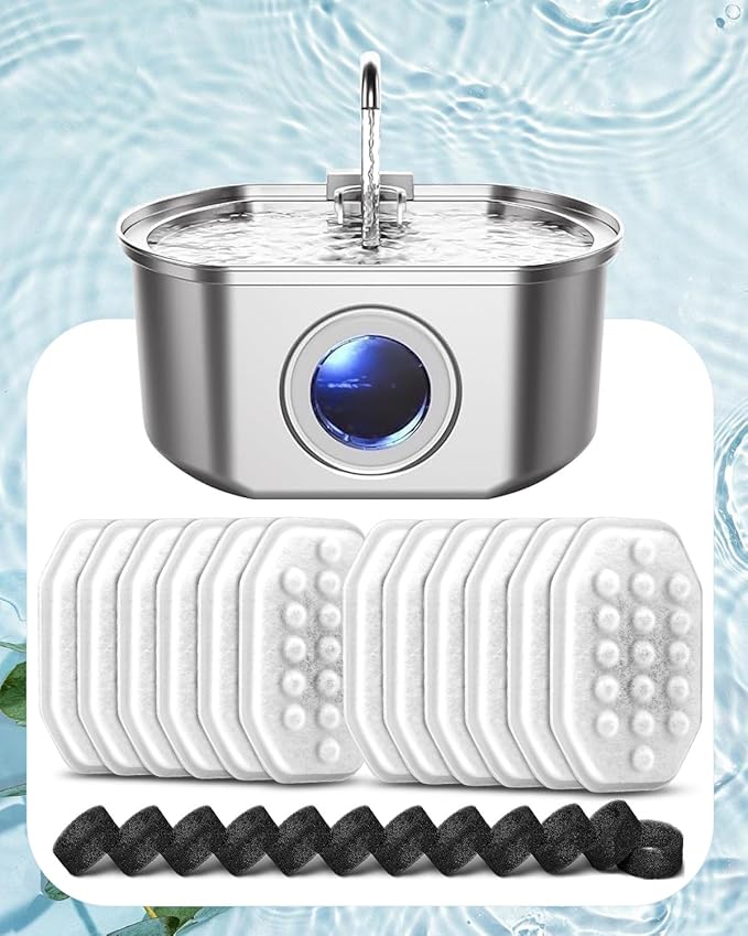 - Package: The package contains 12 Pack Replacement Filters & 12 Pack Pre-Filter Sponges. This pet fountain filter replacement set is used for stainless steel 3.2L/108oz Pet Cat Water Fountain.
