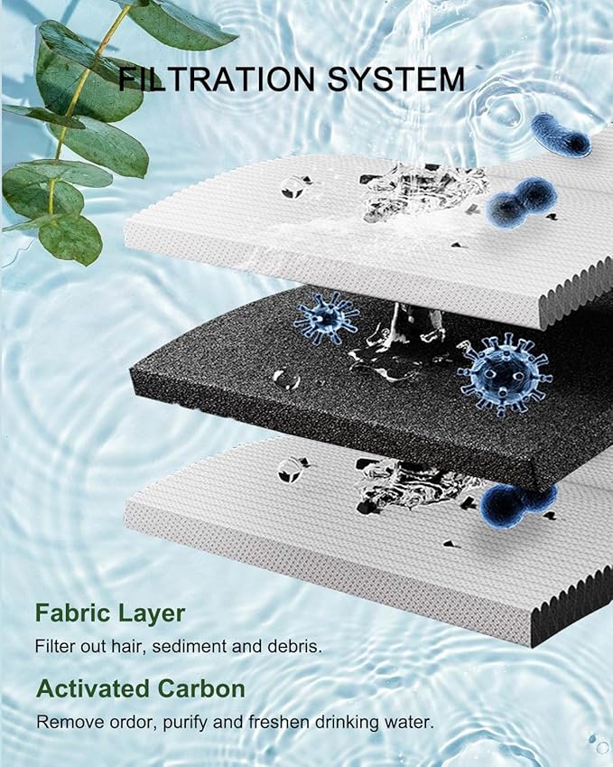 - Clean Water: Our multi-stage filtration system, featuring activated carbon encased in high-density fabric, provides pets with clean, fresh, and great-tasting water.
