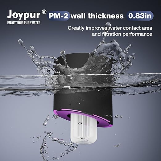 - [NEW UPGRADE] Joypur countertop water filter, with a new upgraded Austenitic 18/8 stainless steel, will not be corroded by the outside air and residual chlorine in the water, it is a healthy stainless steel, and set up a visible transparent water level window, no need to open the top cover to easily observe the water level. And the new upgraded black filter element PM-2 wall thickness increased to 0.83in, other brands only 0.5in-0.55in, greatly improves water contact area and filtration performance, so that the water is more healthy and safe.