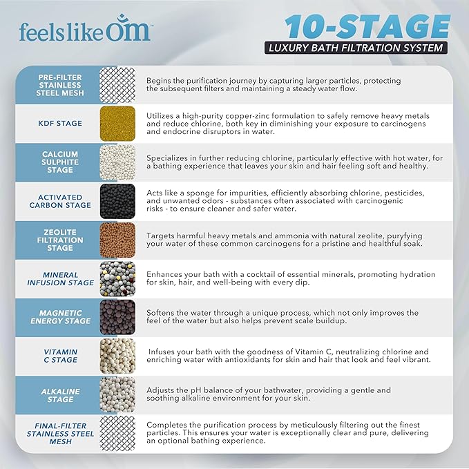 - SAFE BATH WATER FILTER: Feels Like Om bathtub faucet system uses 10-stage filtration to remove 99% of chlorine and harmful chemicals. A perfect bath water filter that creates the safest and gentlest bathing experience for your little ones.