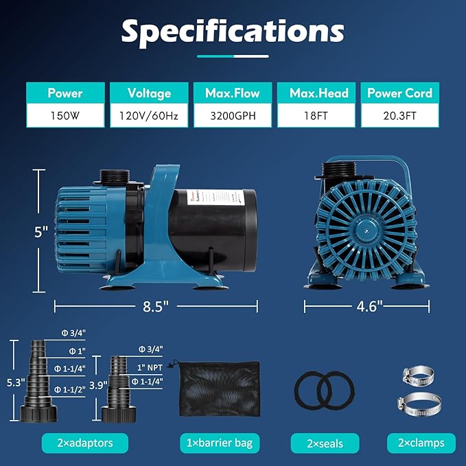- POWERFUL POND PUMP: This 150W submersible water pump delivers 3200 GPH and lifts water up to 18ft, making it the perfect koi pond pump or fish pond pump for backyard fountains, waterfalls, and other pumps for ponds applications. It works well submerged or on land (best submerged).