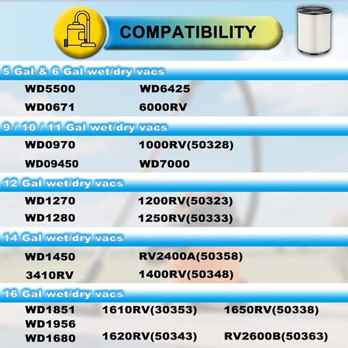 - FILTER COMPATIBILITY: Compatible with RIDGID vacs 5 gal. or larger, models # 5 Gallon: WD5500. // 6 Gallon: WD0671, WD6425, 6000RV(50308). // 9 Gallon: WD0970, WD09450. // 10 Gallon: 1000RV(50328). // 11 Gallon: WD7000. // 12 Gallon: WD1270, WD1280, 1200RV(50323), 1250RV(50333). // 14 Gallon: WD1450, 3410RV, RV2400A(50358), 1400RV(50348). // 16 Gallon: WD1851, WD1680, WD1956, RV2600B(50363), 1650RV(50338), 1620RV(50343), 1610RV(50353).
