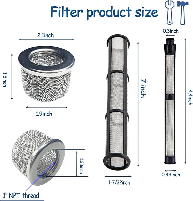 - ❤【Packaging includes】:Double stainless steel mesh Suction tube filter screen 181072×2PC(Latex30Mesh), Pump inner core filter screen(Latex 60 Mesh): 244067×4PC, Gun filter screen (Latex 60 Mesh):287032 x5PC