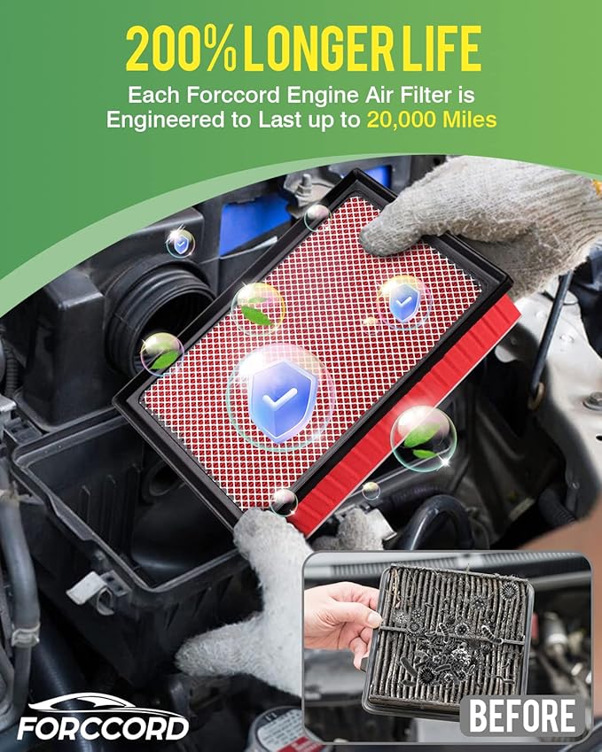 - 【 200% Longer Life】 Compare with Standard air filter, we adopts advanced HV filter paper with higher filtering precision, to absorb 99.9% of impurities (hair,fines,dust and flocs etc.).For the service life, each engine air filters are engineered to last up to 20,000 miles, 200% longer than the standard performance, less replacement.