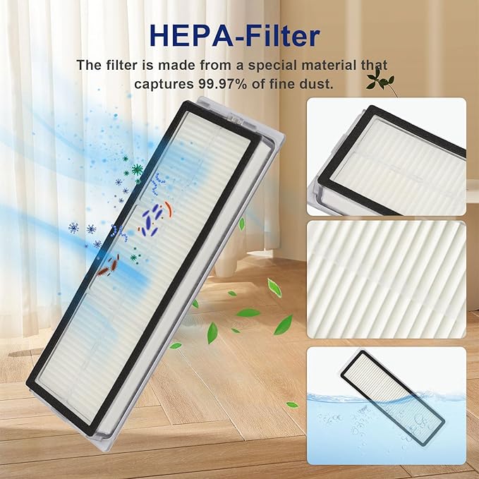 - WHAT'S INSIDE: 1x Main Brush, 4x Side Brushes, 4x Dust Bags, 4x Mop Cloths, 2x Washable Filter