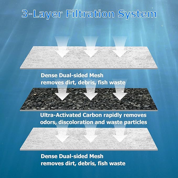 - [Upgrade to triple filtration] : Renami aquarium filter uses dense dual-sided mesh to maximize the capture and filtration of debris and fish waste. Ultra-Activated carbon rapidly removes odors, discoloration, maintains pH balance, and keeps aquarium water crystal clear.