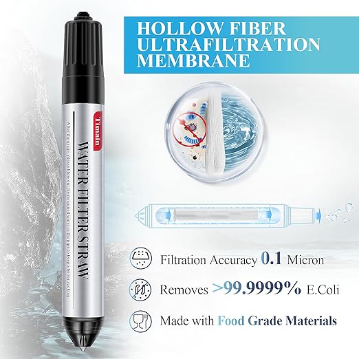 - Advanced Filtration Technology:Timian mini water filter is designed with a hollow fiber membrane to effectively remove 99.9999% of E.Coli and the smallest micro plastics from surface water,at 0.1-micron filtration.