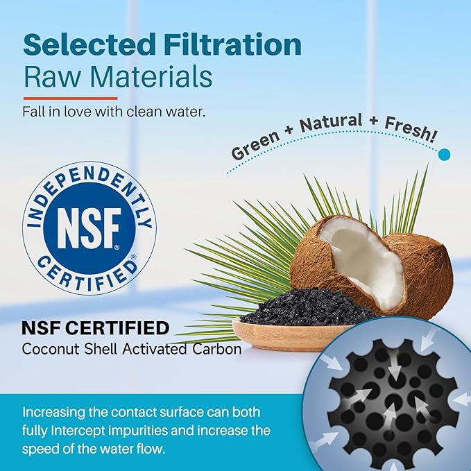 - Premium Filter Materials: All the products of ICEPURE filter material are 100% selected natural coconut shell activated carbon and certified by NSF. It has a larger specific surface area, more micropores, and more clean. Certified by NSF 372, which ensures the filter is lead-free: food grade material, BPA-Free. Choose ICEPURE, Choose a more assured lifestyle!