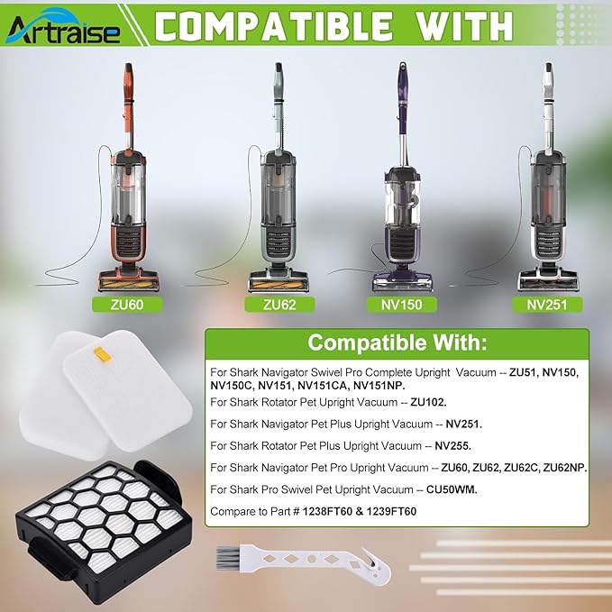 - PERFECT FITS: These premium navigator lift away filter replacement filters are compatible with For Shark Navigator Swivel Pro Complete Upright ZU51, NV150, NV150C, NV151, NV151CA, NV151NP, ZU102, NV251, NV255, ZU60, ZU62, ZU62C, ZU62NP, CU50WM. Compare to Part # 1238FT60 & 1239FT60