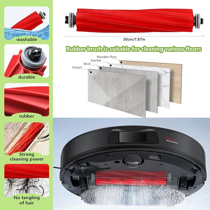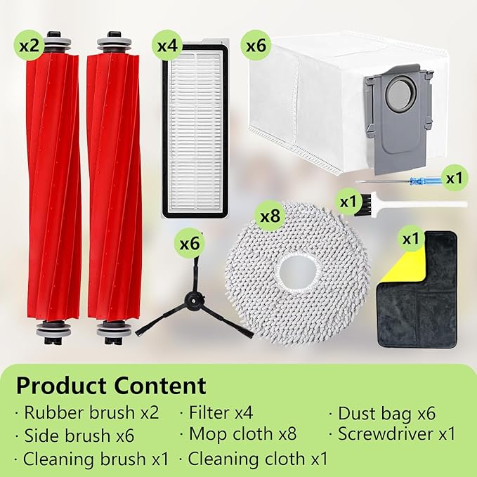 - High cost performance:Includes 2 Main Brush Roller,6 Black Side Brush,4 Hepa Filters,8 Mop Pads,6 Dust Bags,1cleaner brush, 1 water tank brush,1 screwdriver ,29pcs