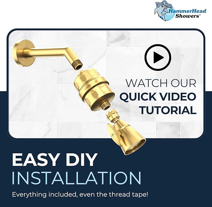 HammerHead Showers® Solid Metal Shower Head Filter – KDF 55 Shower Filter, High Pressure Universal Shower Filters to Remove Toxic Chemicals – Removes Chlorine and Heavy Metals – Brushed Gold