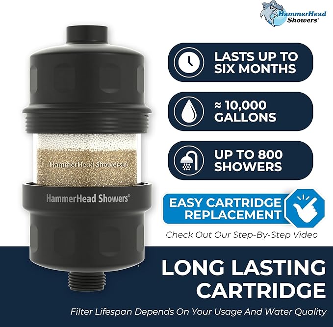 - HIGH OUTPUT CARTRIDGE – This chlorine shower filter has a large cartridge rated for 6 MONTHS or 10,000 GALLONS of use. HASSLE-FREE REPLACEMENT: simply unscrew the housing, switch the old cartridge for the new one, and reattach the housing.